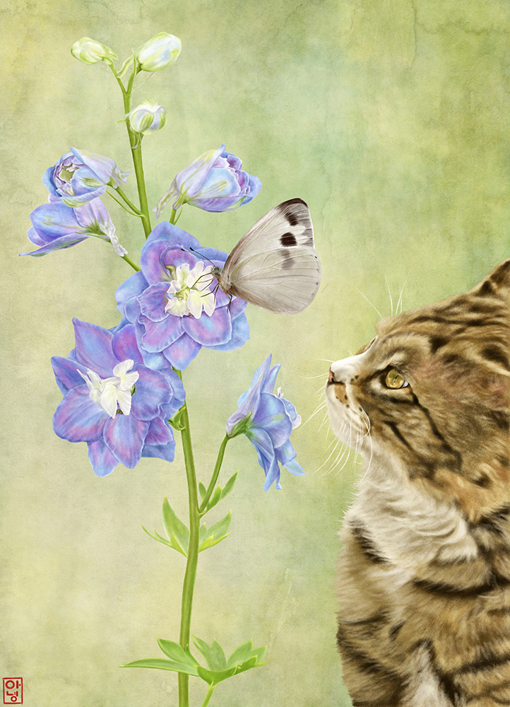Cat looking at the delphinium flowers