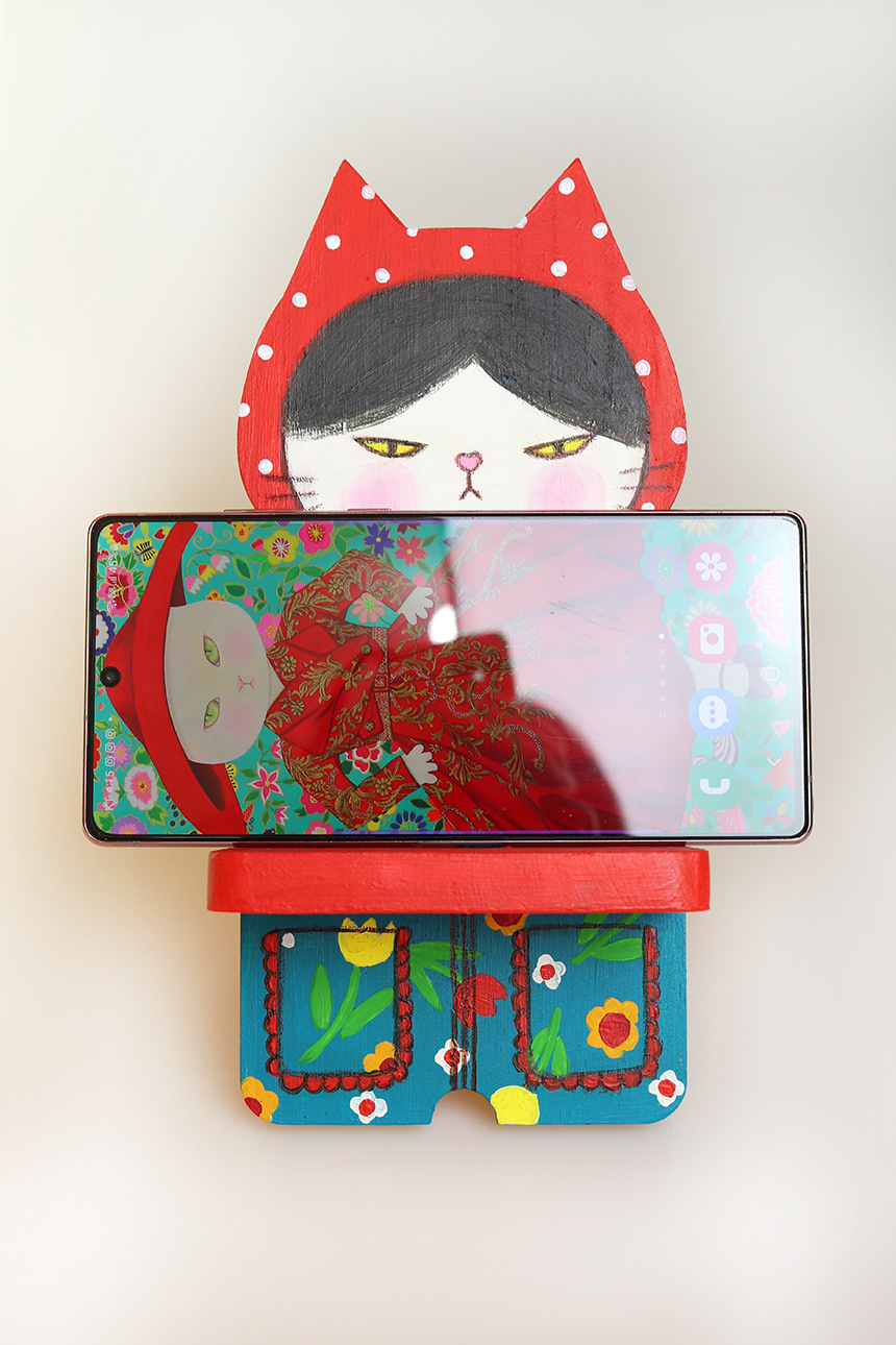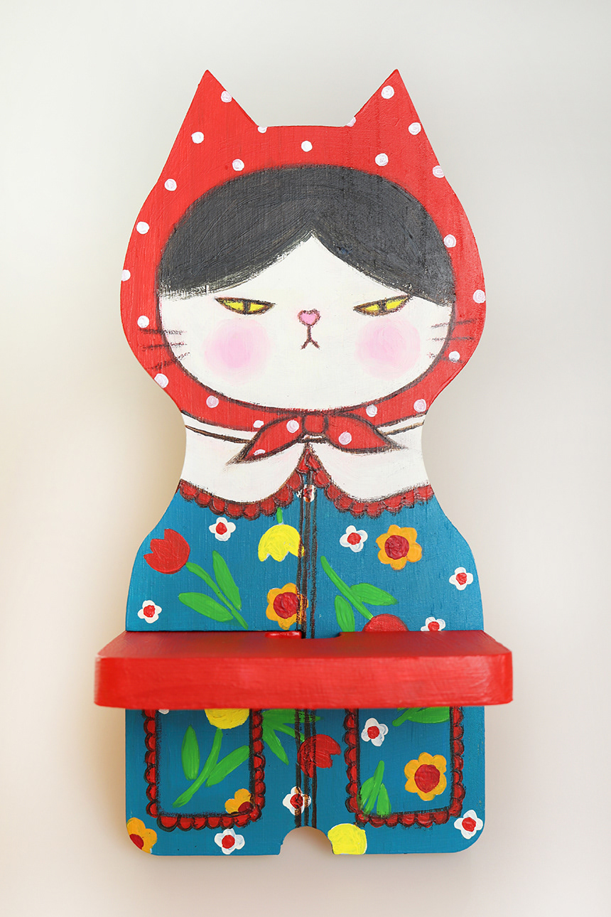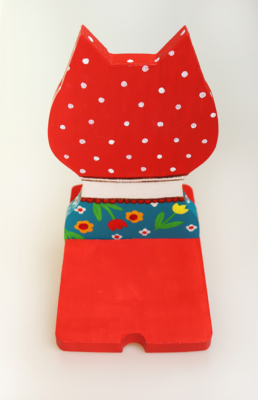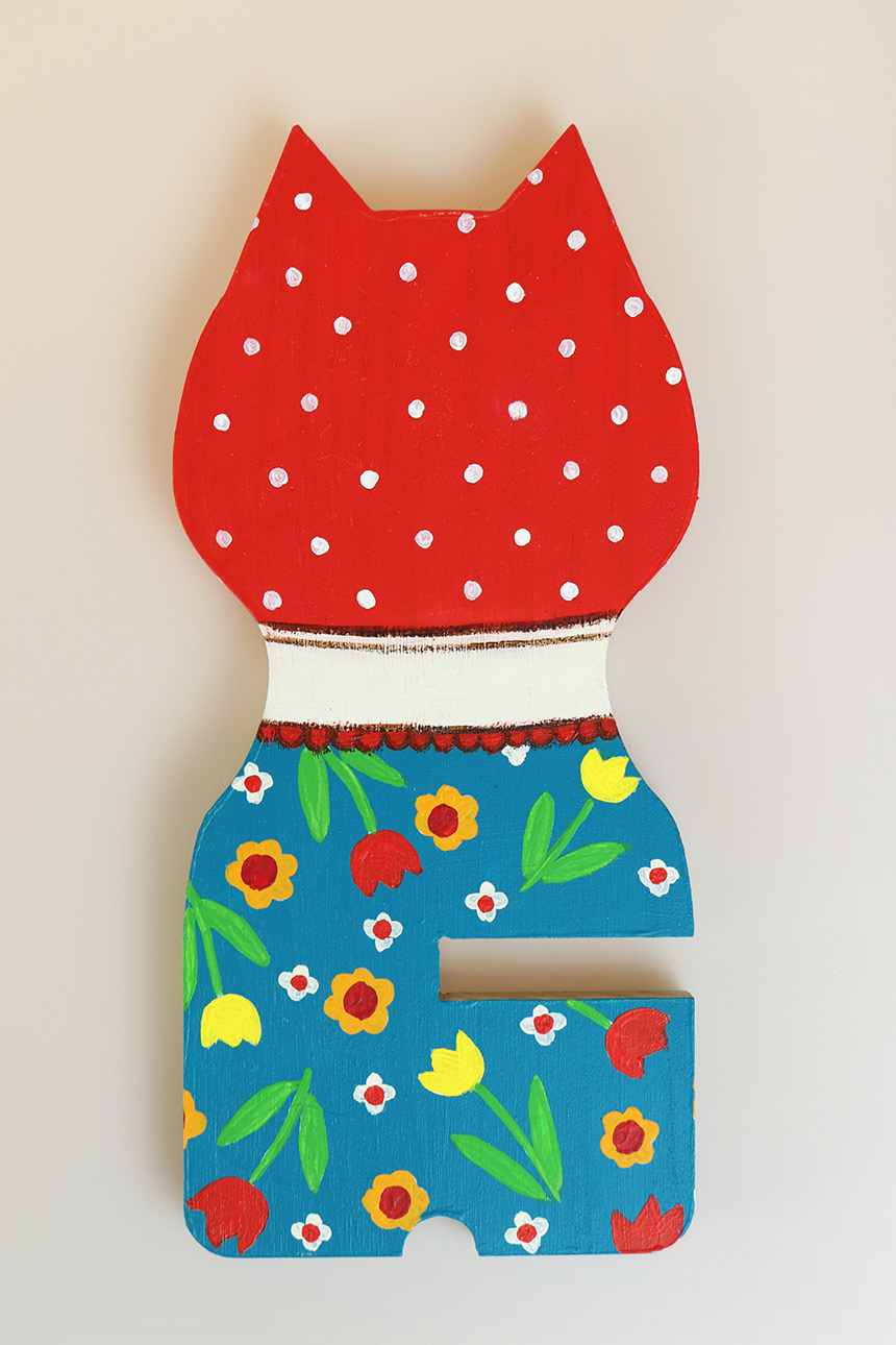 This is a cat painted with acrylic paints on a wooden phone holder.