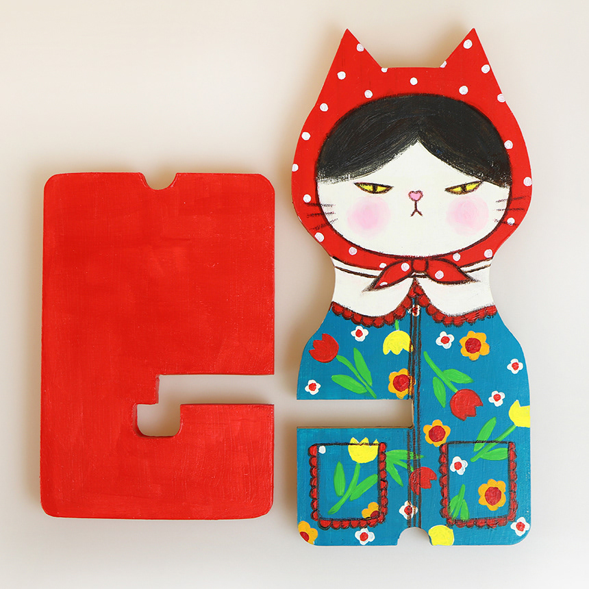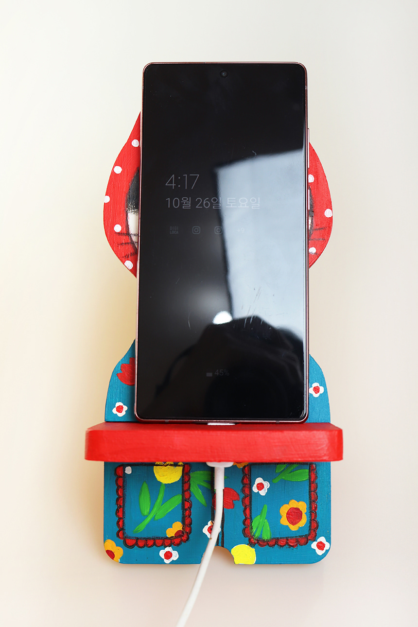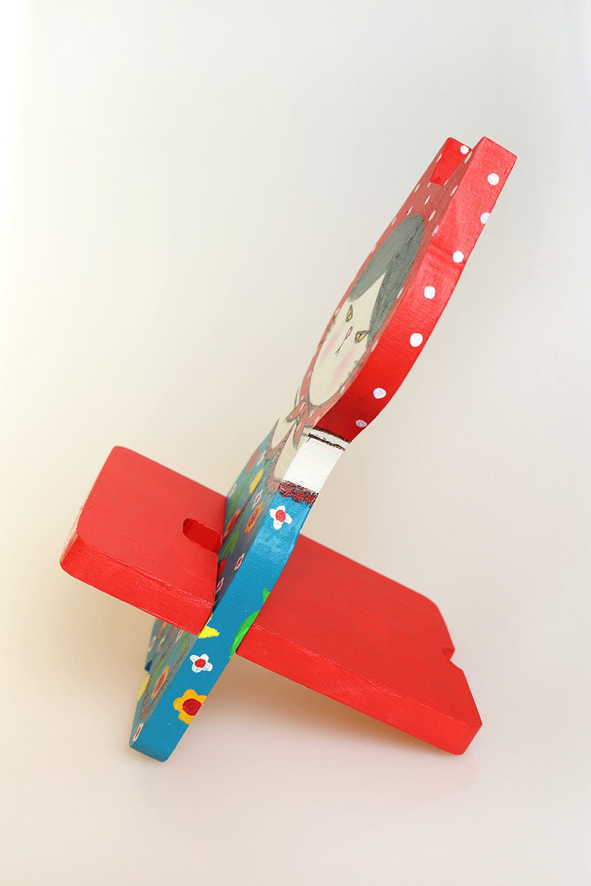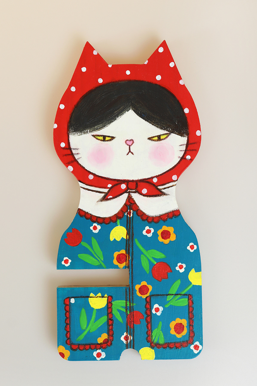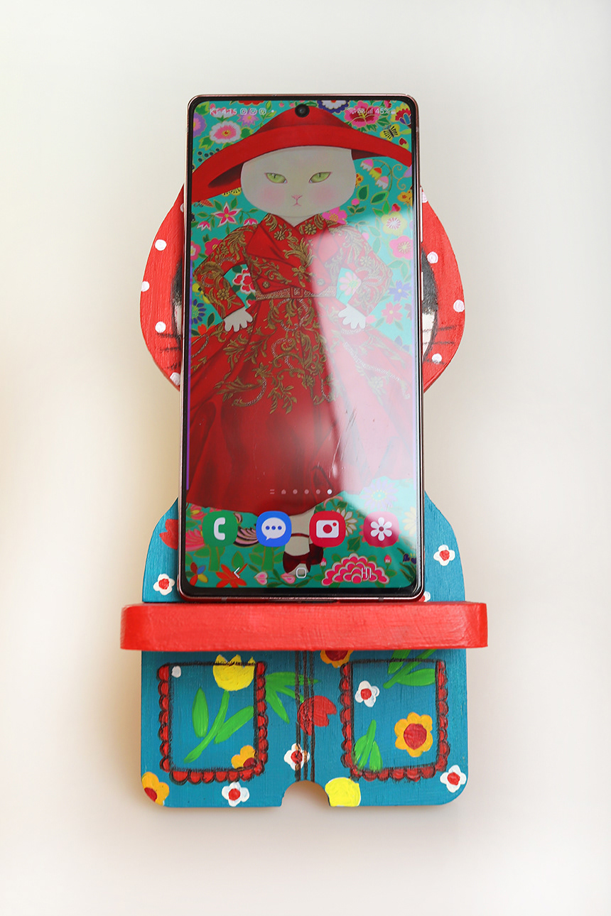 This is a cat painted with acrylic paints on a wooden phone holder.
