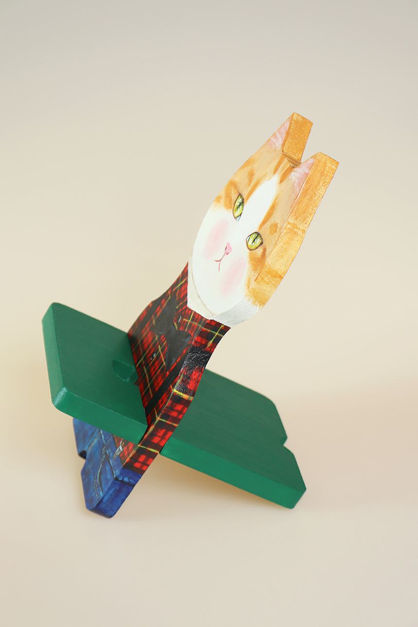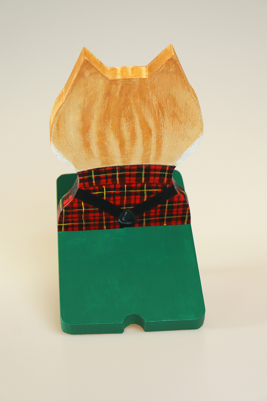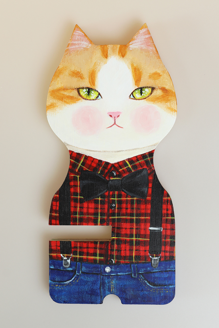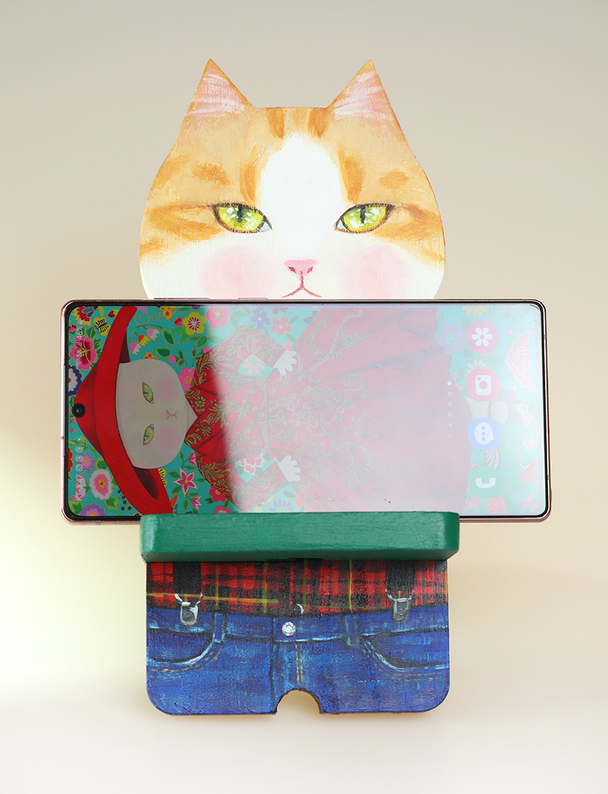 This is a cat painted with acrylic paints on a wooden phone holder.