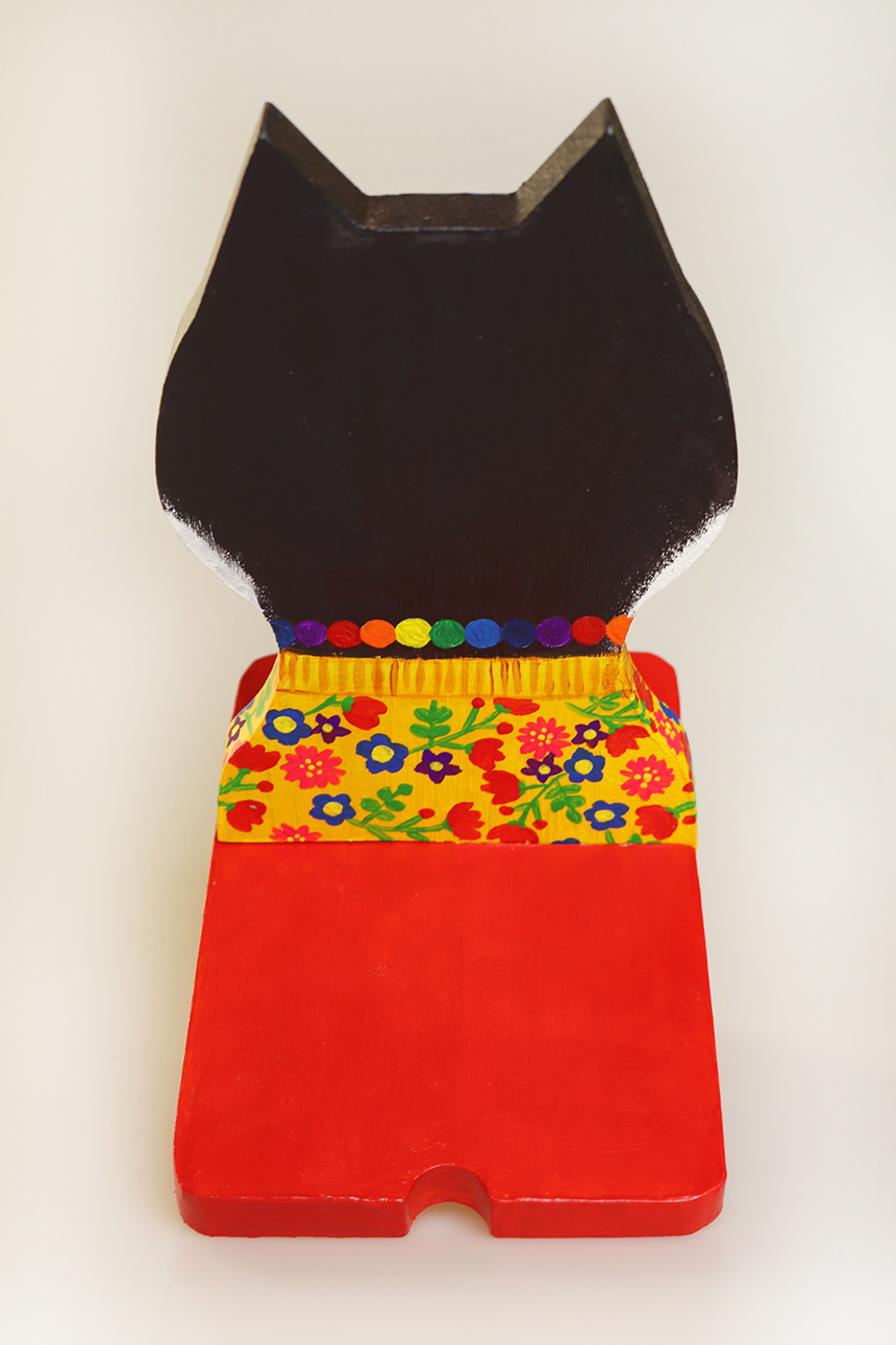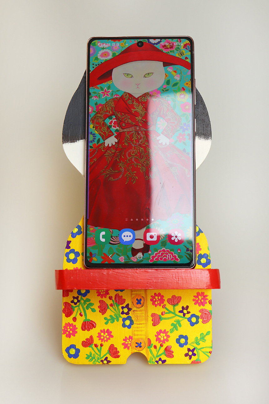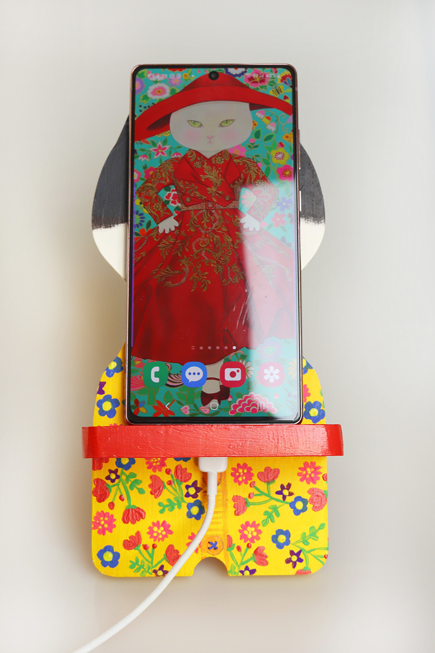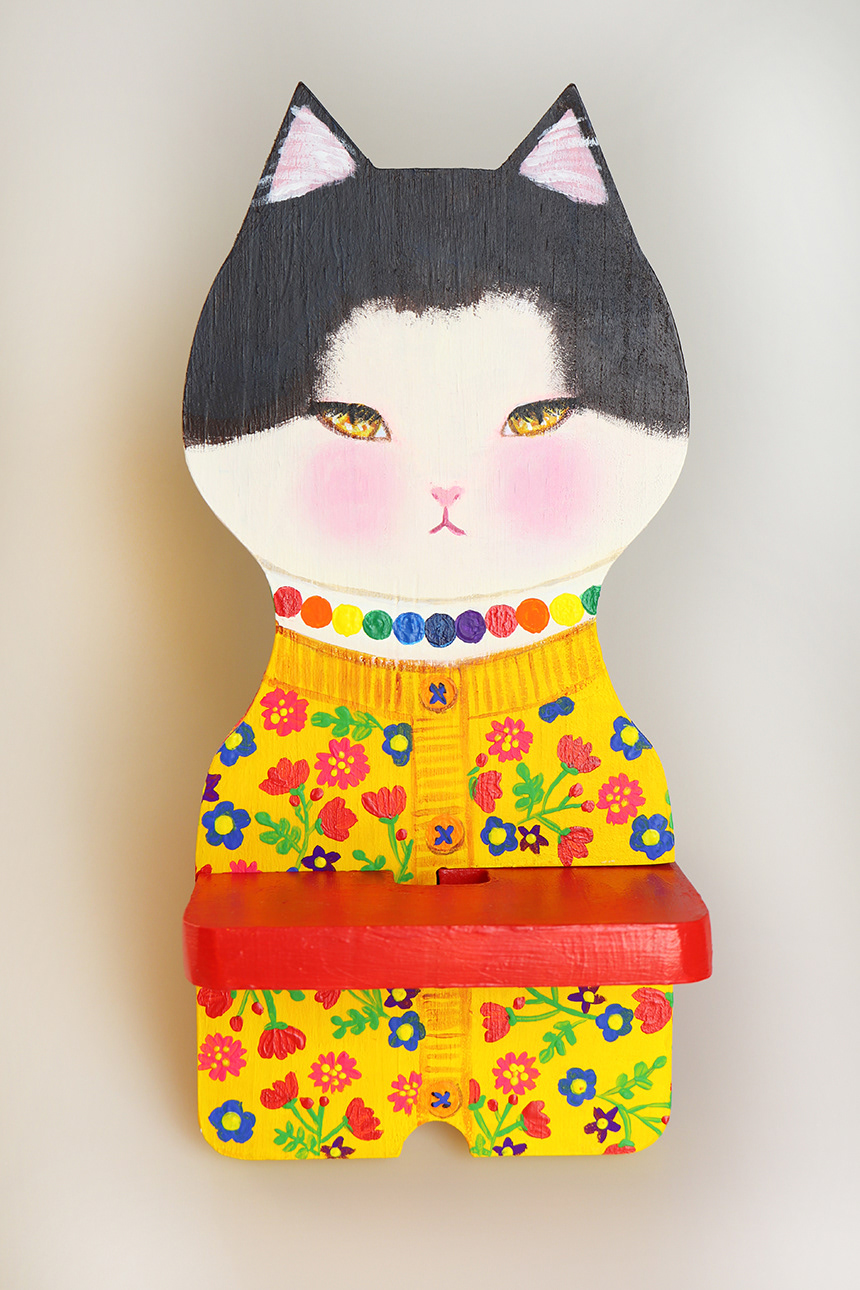 This is a cat painted with acrylic paints on a wooden phone holder.